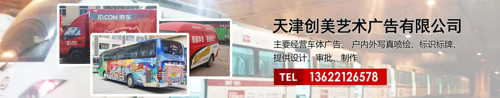 天津創美藝術廣告有限公司主要經營車體廣告、 戶內外寫真噴繪、標識標牌、提供設計、審批、制作、發布的服務。